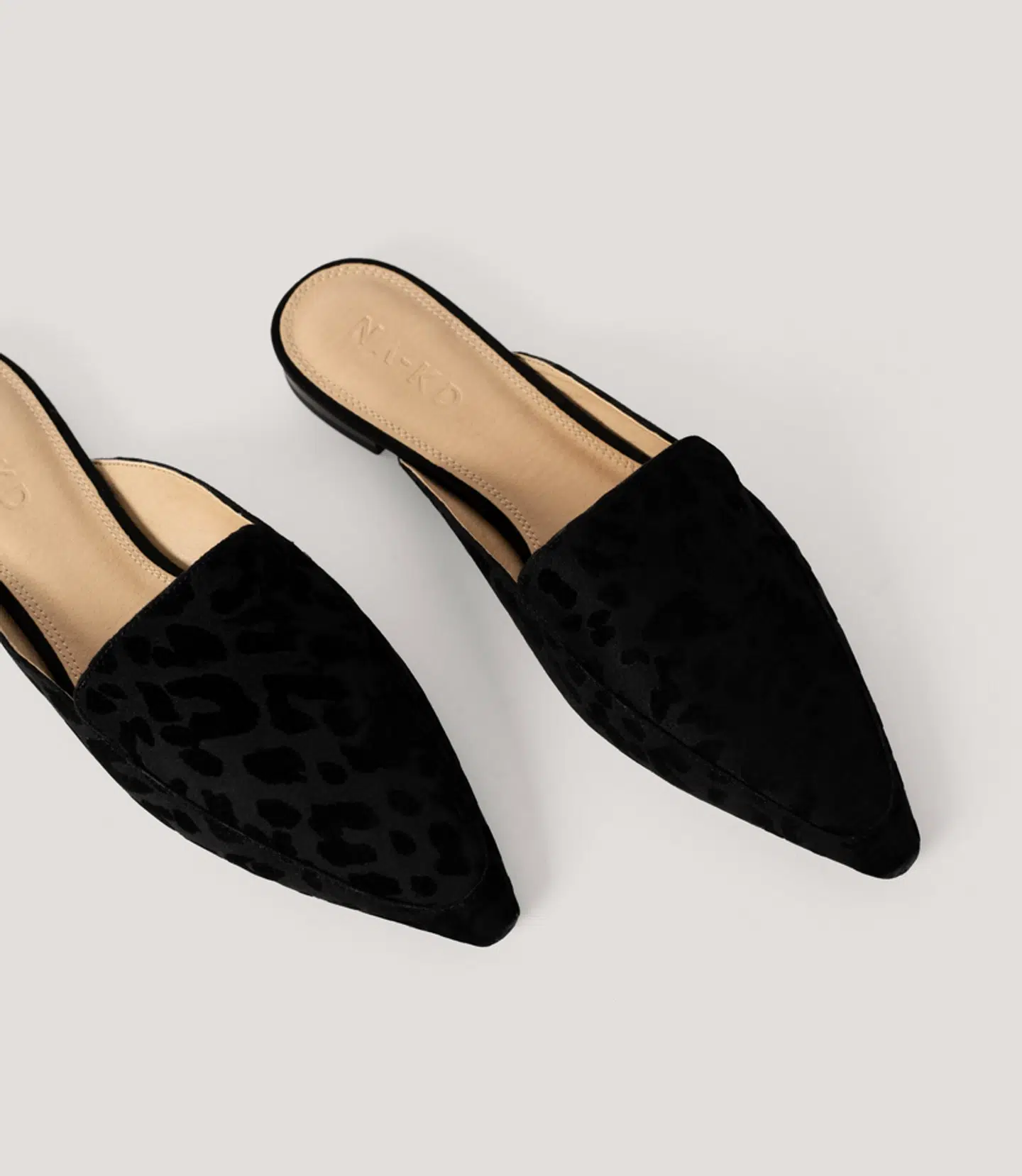 Slippers med spids tå og leopard-mønster. Farve: Sort
