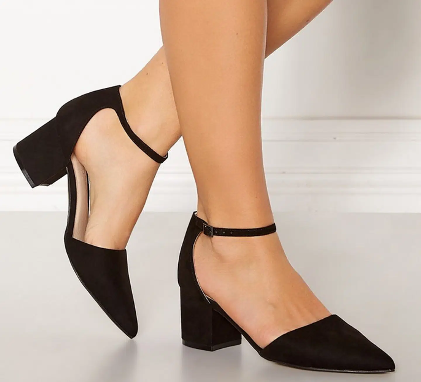 Superflotte højhælede sko fra BIANCO. Skoene er fremstillet i flot, imiteret ruskind og passer godt til hverdag eller festlige lejligheder. Spids tå. Lukkes med spænde omkring anklen (justerbar). Hælhøjde: 6 cm. Farve: Sort
