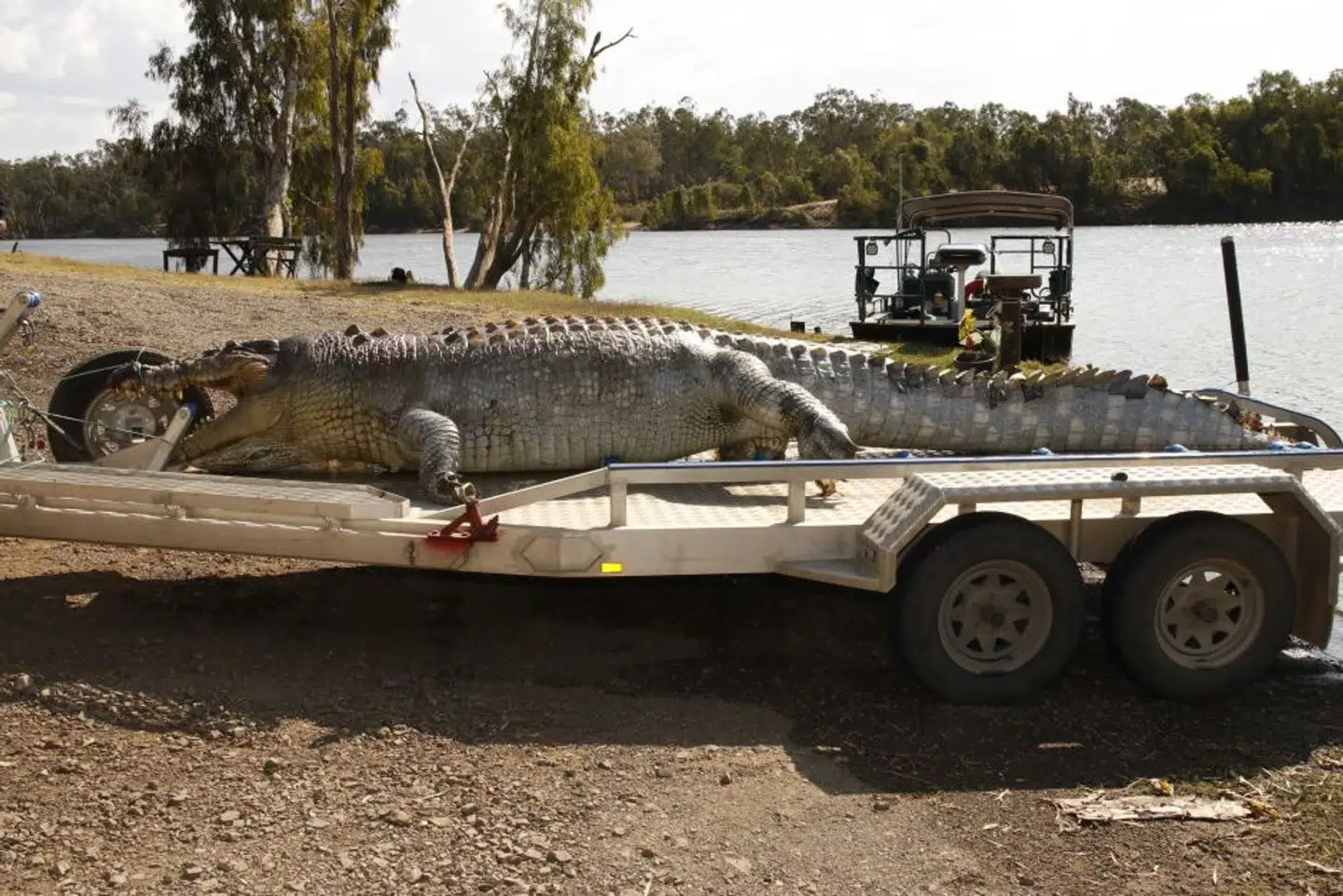 De lokale fik skaffet en kranvogn og fik krokodillen ud af fare og tilbage mod dens naturlige habitat. Der var dog ikke så meget fart over det enome dyr, der måtte have et par venlige skub med på vejen fra kranens skovl, da folk ikke rigtigt turde at komme for tæt på rovdyret.