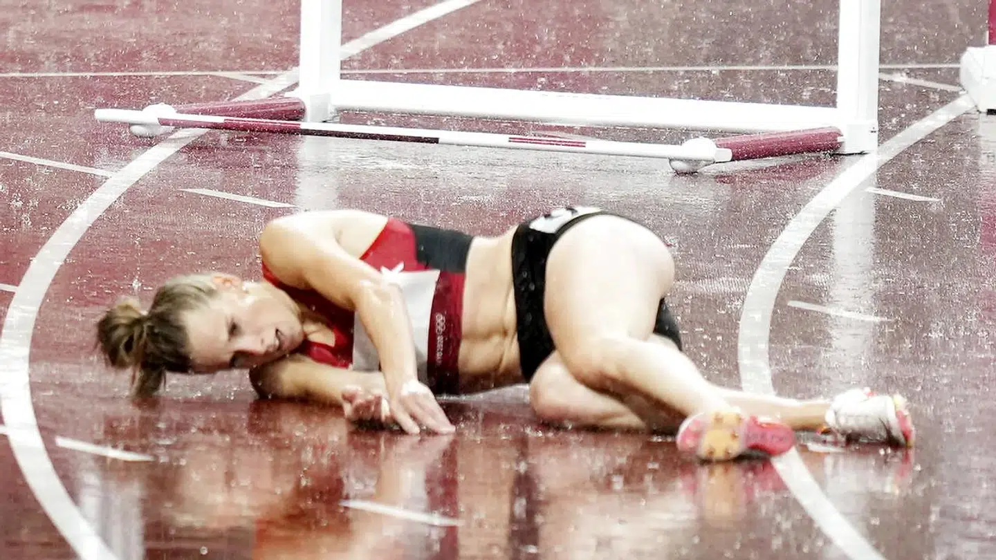 Hun styrter i sidste sving over hæk nummer otte. Hun får sin ene fod under hækken, og et splitsekund senere styrter hun mod den røde løbebane.