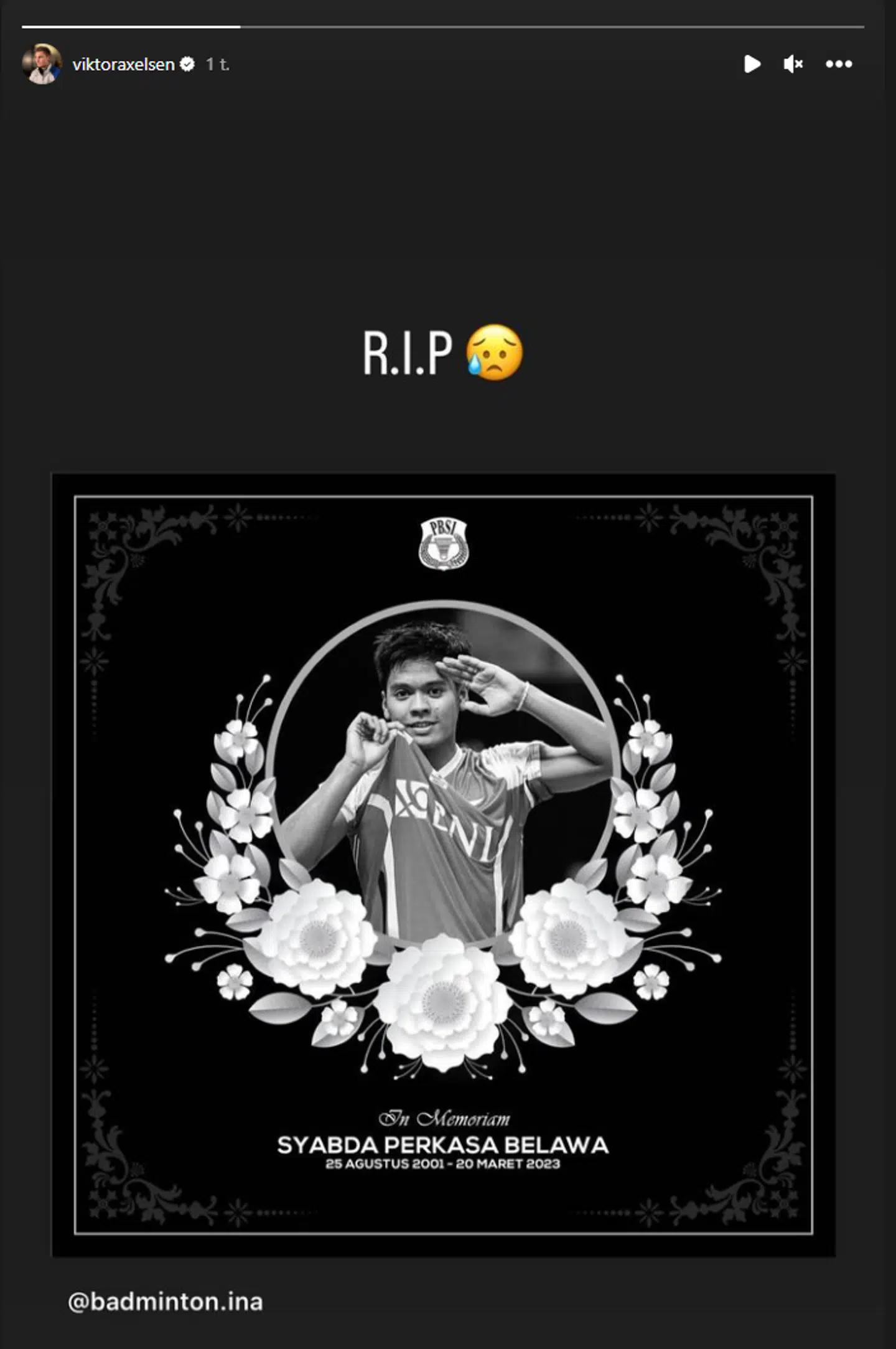 'R.I.P. (hvil i fred, red.)' skriver Viktor Axelsen over et billede af Syabda Perkasa Belawa – efterfulgt af en 'ked af det'-emoji.