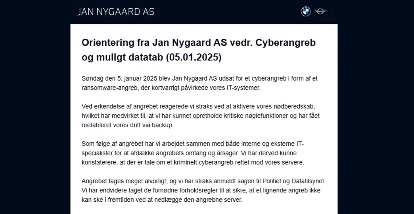 »Søndag den 5. januar 2025 blev Jan Nygaard AS udsat for et cyberangreb i form af et ransomwareangreb, der kortvarigt påvirkede vores it-systemer.«