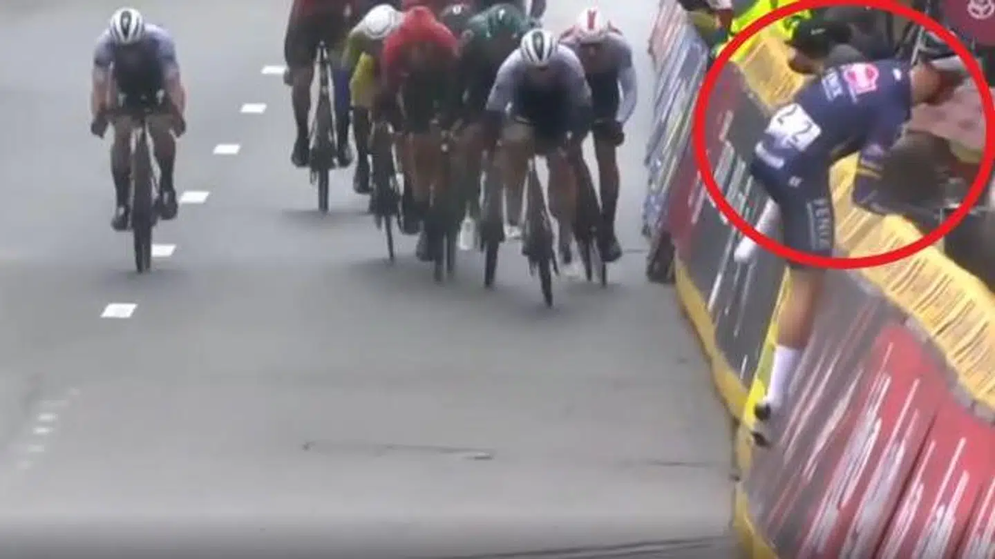Men hvad Tim Merlier ikke havde regnet med, var, at han pludselig måtte smide cyklen ud mod publikum og springe over afspærringen for at undgå sammenstød med en gruppe ryttere, der kom imod ham i topfart.
