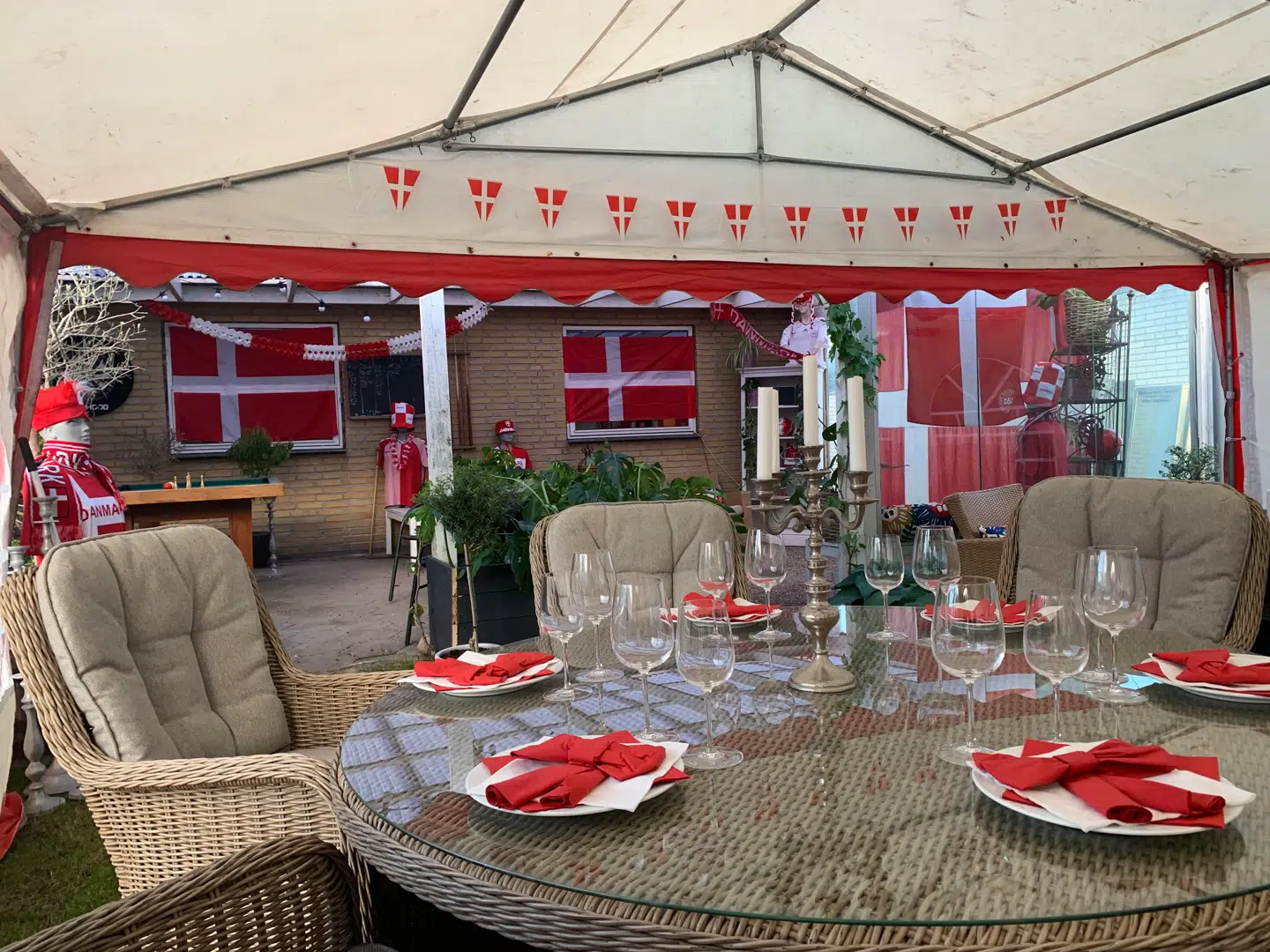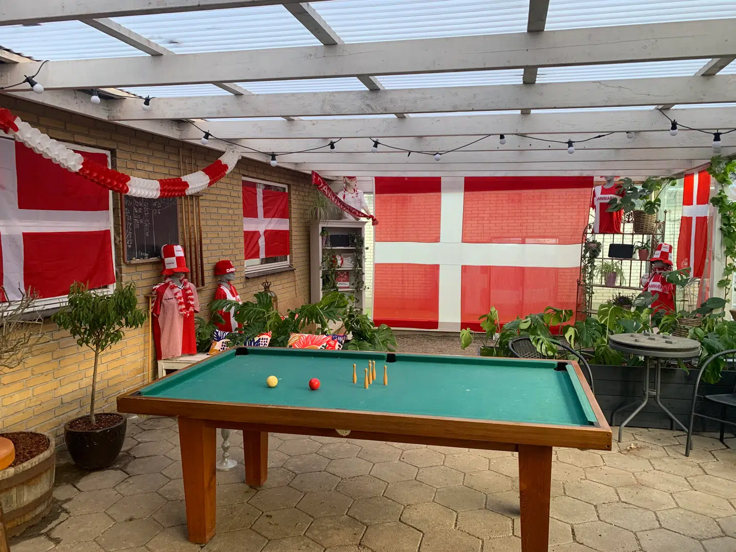 »Hvis vi medregner hele baren, diskolys, fadølsanlæg og lejet mobildiskotek, så løber det op. Alene i flag, lys og Danmarks-gejl har det nok kostet et par tusinde kroner,« fortæller Thomas Nymann, der til lejligheden også har skaffet et billardbord.