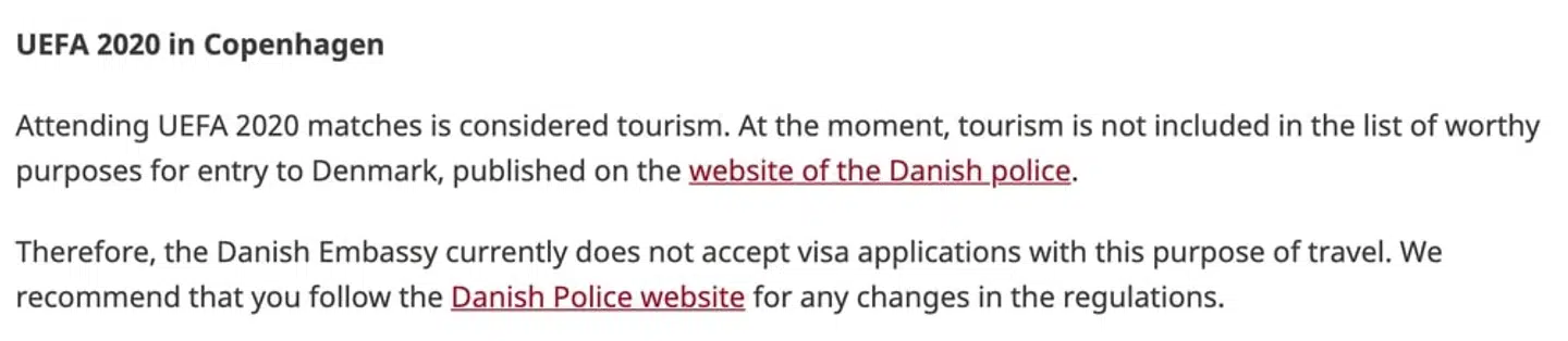 Rusland hører i øjeblikket under kategorien 'orange lande' på en liste lavet af den danske regering. EM og fodbold hører ifølge restriktionerne ind under turisme, og turisme anses ikke i øjeblikket som et anerkendelsesværdigt formål for indrejse i Danmark, hvis man kommer fra et 'orange land'. Derfor er den russiske ambassade i øjeblikket nødt til at afvise samtlige visaansøgninger fra de forventningsfulde fodboldfans.