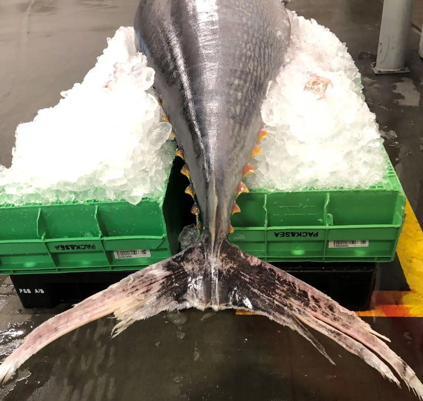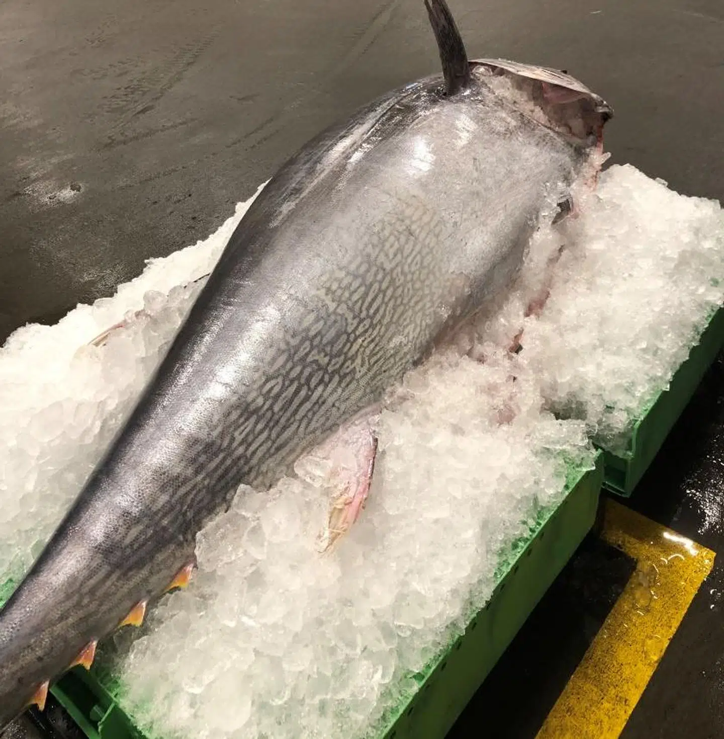 En 240 centimeter lang fisk med en kampvægt på 198 kilo landede søndag på dækket af en tysk fiskekutter og herefter på isen på en fiskeauktion.