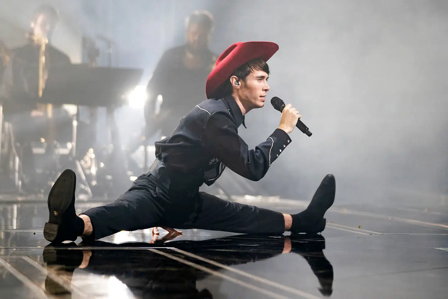 Kristian Kjærlund kom på scenen indhyllet i røg med lilla cowboyhat og sort westernskjorte på og fik publikum til at juble, da han i slutningen af sin sang gik i spagat på scenen.