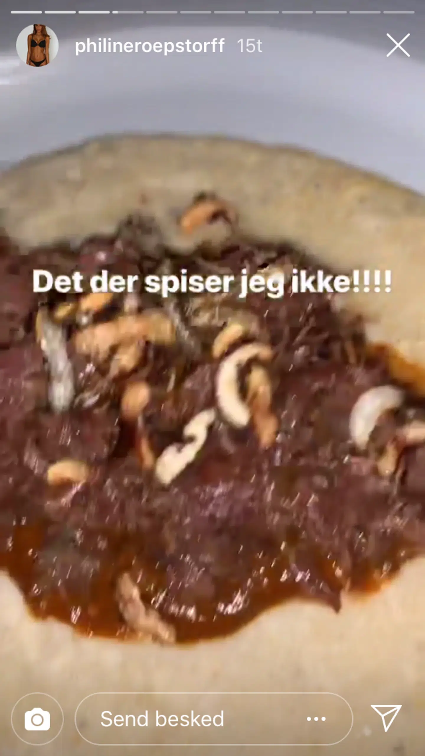Først rendte Philine Roepstorff ind i en mere end tvivlsom portion aftensmad. En ret, som hun prompte afviste at spise: