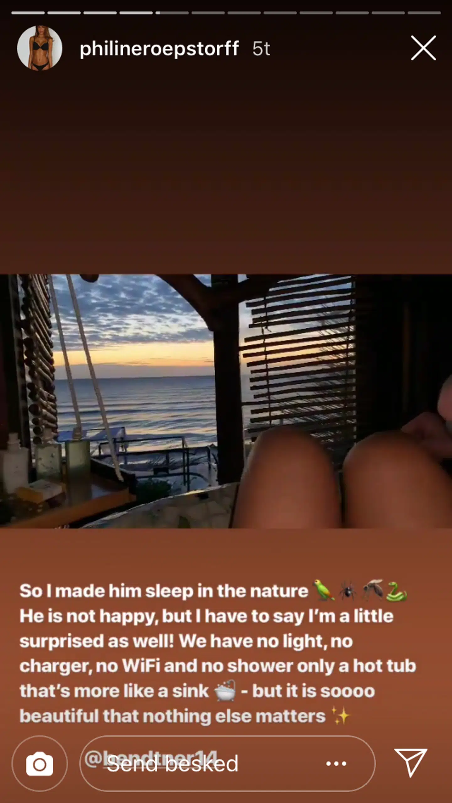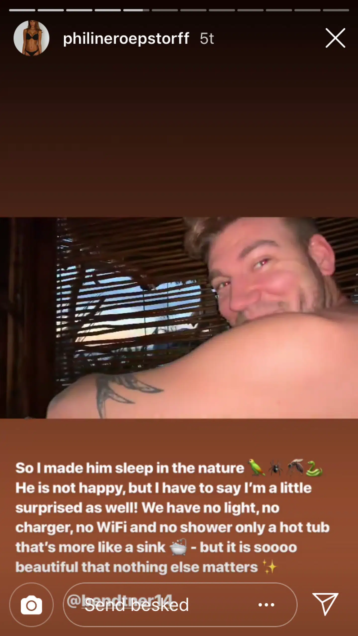 'Jeg fik ham til at sove i naturen. Han er ikke glad, men jeg må også sige, at jeg også er en smule overrasket. Vi har intet lys, ingen oplader, ingen wifi og ingen bruser - kun et badekar, der mere minder om en håndvask. Men der er så smukt, at intet andet betyder noget,' skriver Philine Roepstorff.