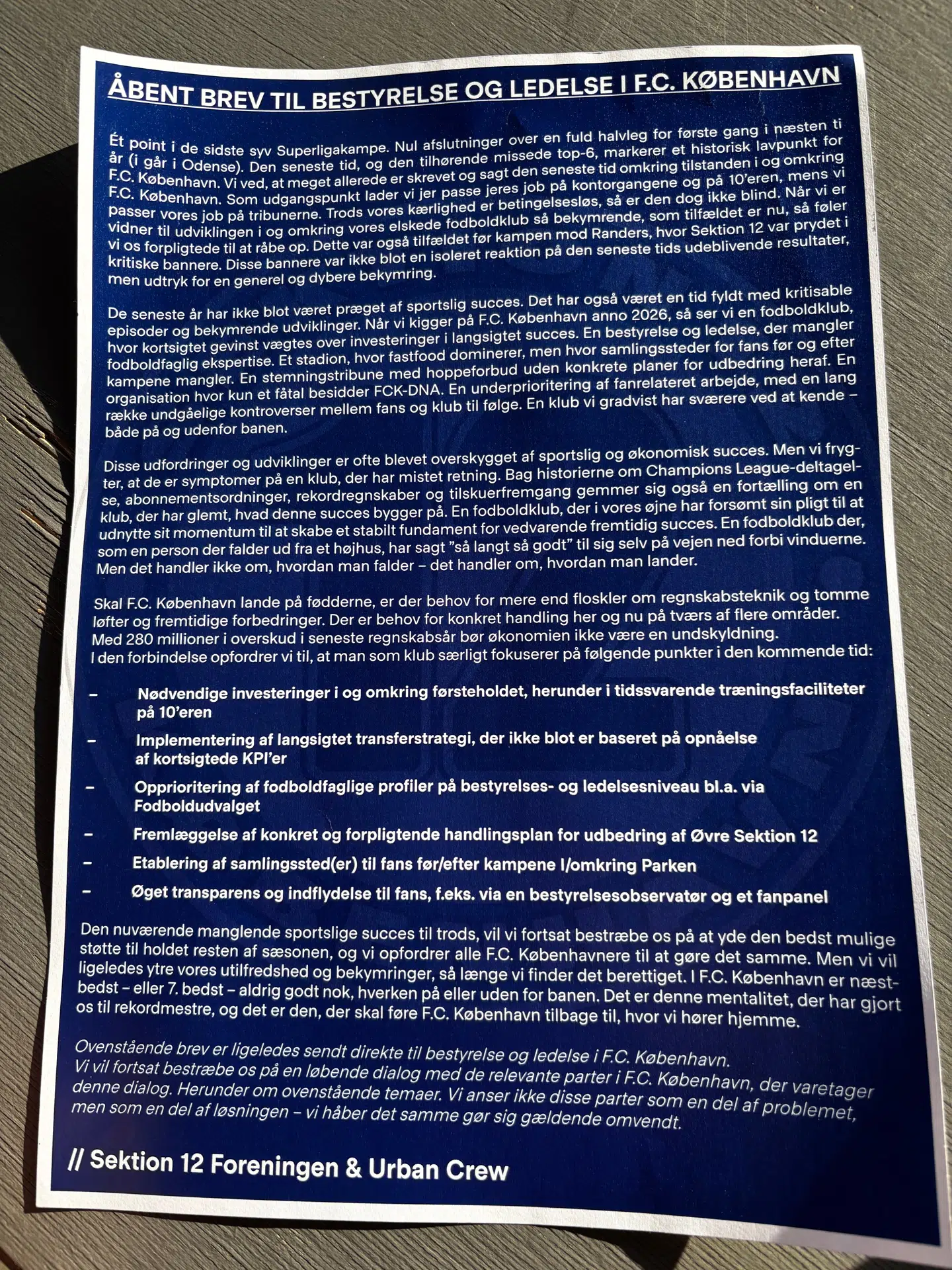 De havde et klart budskab til FCK-ledelsen, der netop har præsenteret et overskud på 280 millioner kroner. Fansene kræver, at pengene bliver brugt til blandt andet at opgradere træningsfaciliteterne og få fodboldfaglighed ind i bestyrelse og udvalg.