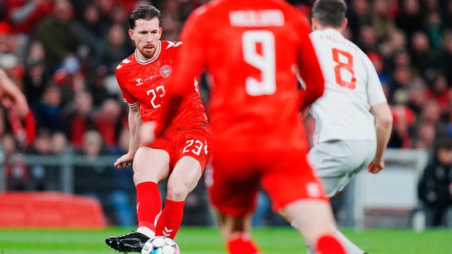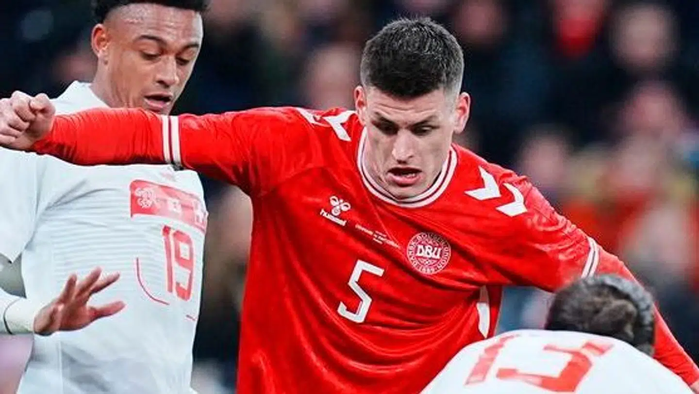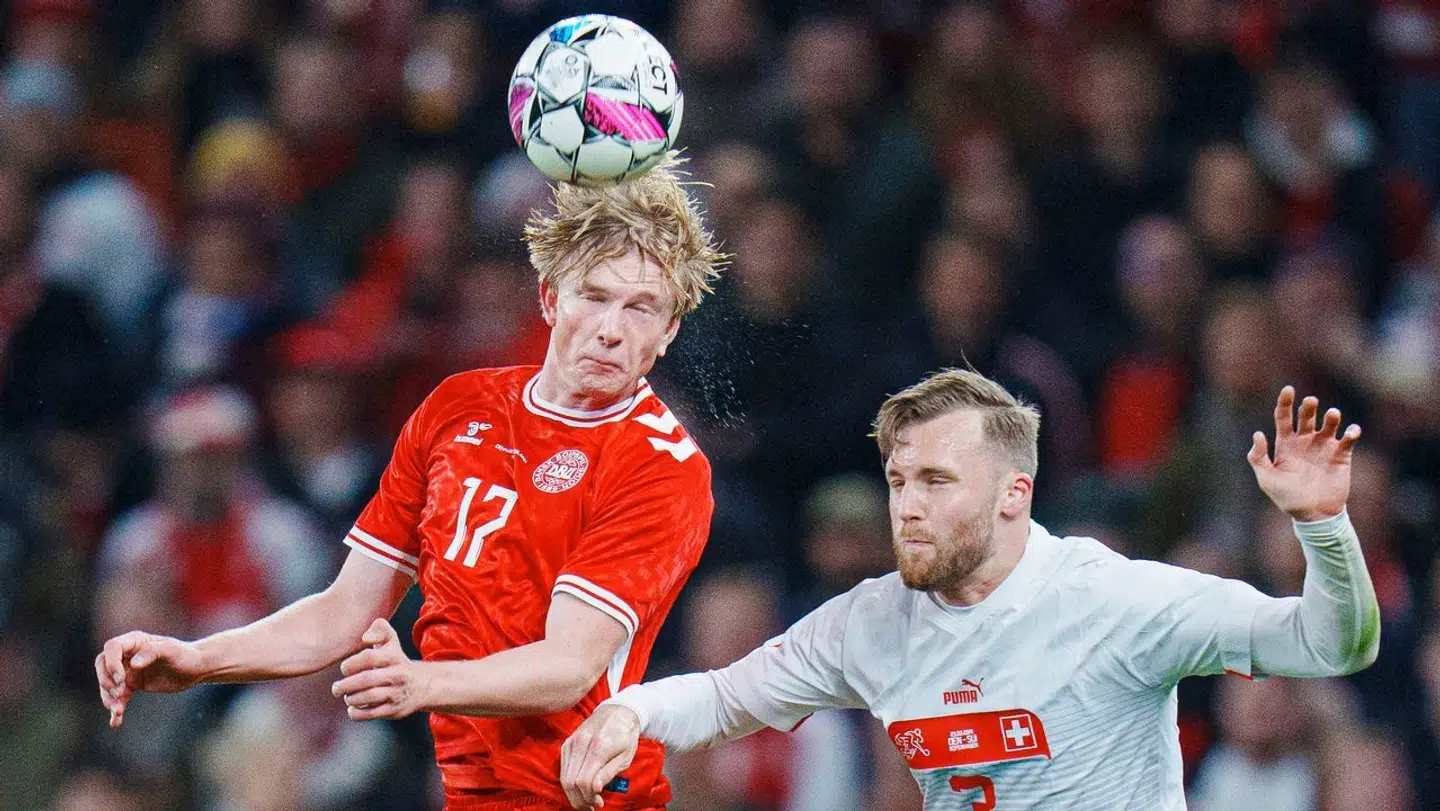 Det danske landshold blev fanget i en farlig schweizisk omstilling, som Jannik Vestergaard flot fik løst med en glidende tackling. Og derefter skulle Højbjerg samle returbolden op - problemet var bare, at hr. Lindhout stod i vejen.