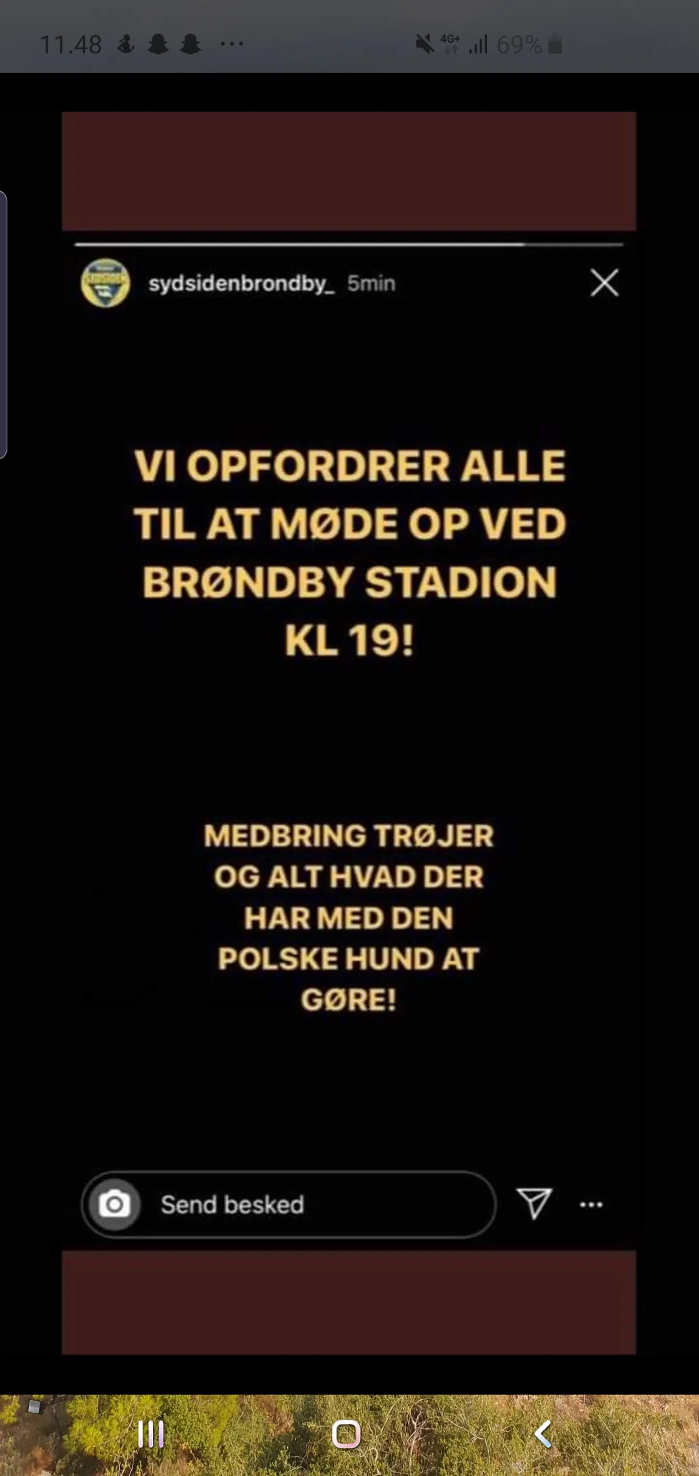 Billedet fra Sydsiden blev slået op som en såkaldt 'story', men blev hurtigt taget ned igen. Efterfølgende har de slået en ny op, hvori der blot står 'Brøndby Stadion kl. 19'.