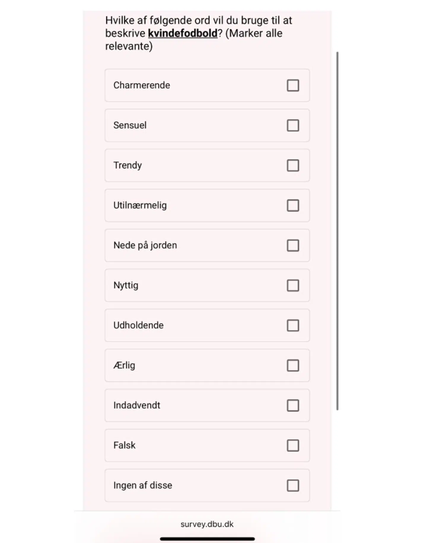 Hvilke af følgende ord vil du bruge til at beskrive kvindefodbold? Ord som 'falsk', 'charmerende', og 'sensuelt' var blandt svarmulighederne.