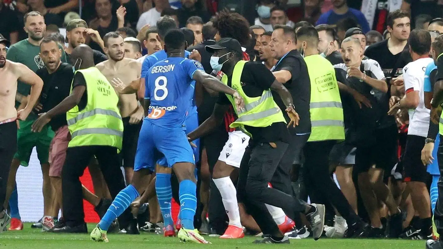 Nice-tilhængerne begyndte så at invadere banen, og det hele udviklede sig til håndgemæng. Blandt andet mellem Nice-spilleren Todibo og Marseilles Gerson.