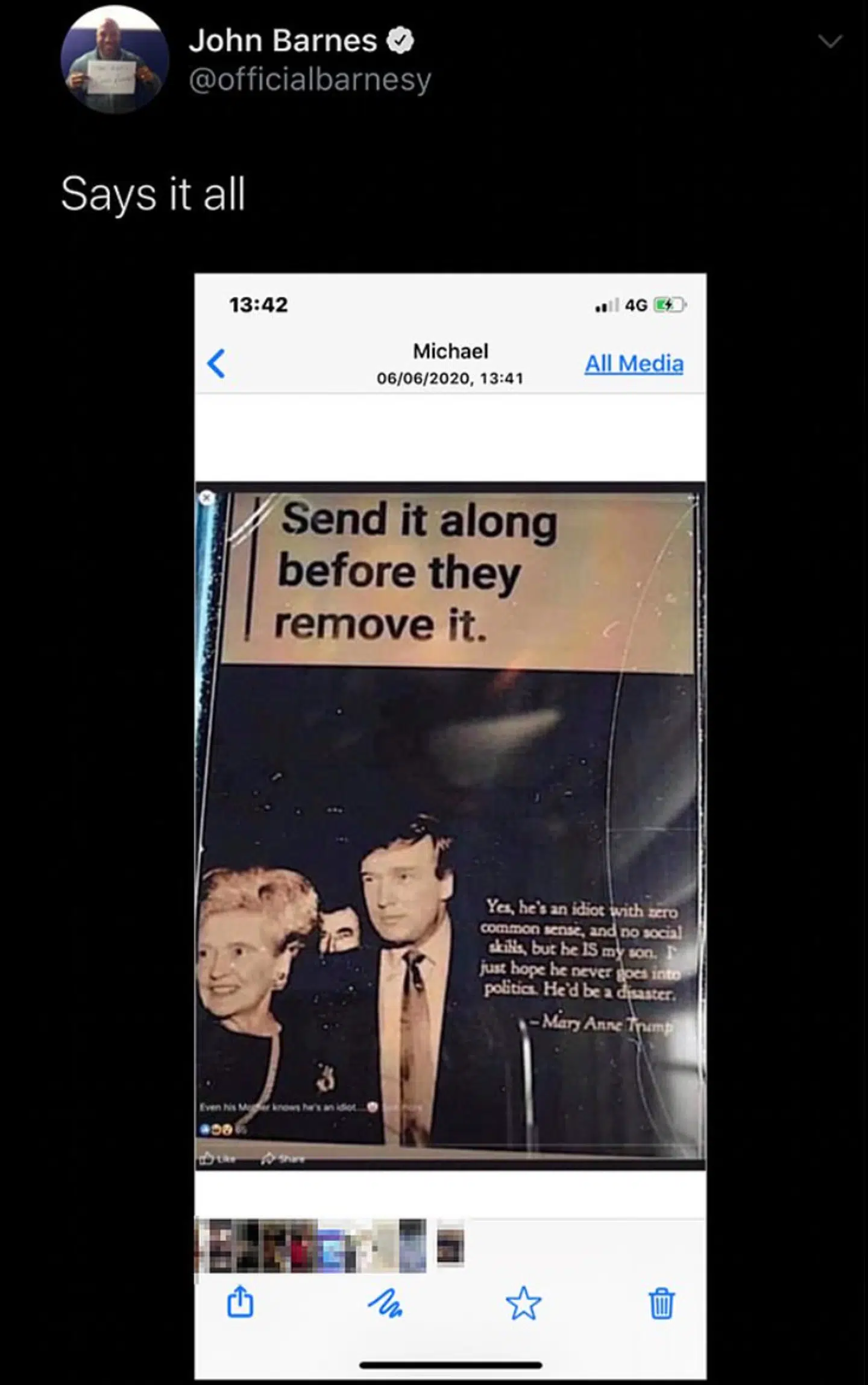 Et billede af præsidenten, der er under hårdt pres for tiden med black lives matter-demonstrationerne i USA, blev lagt op af John Barnes med teksten: