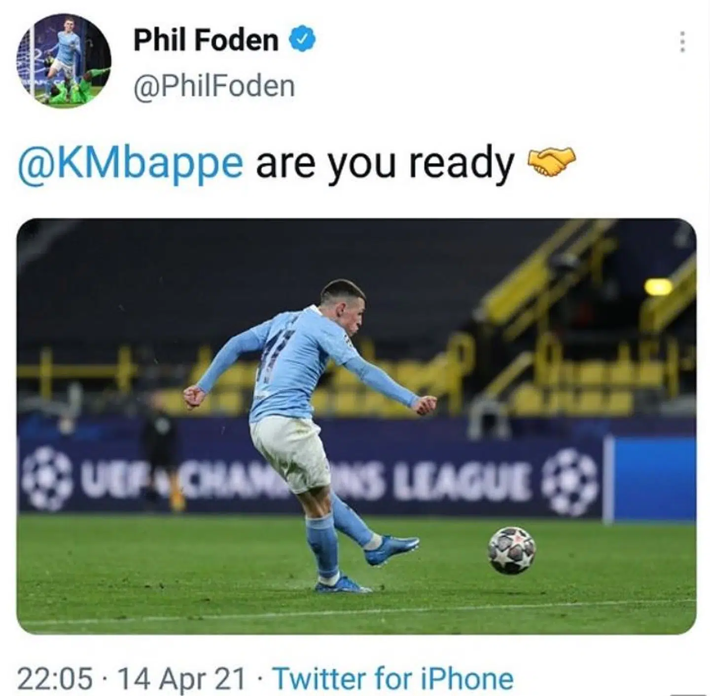 Foden kunne efter onsdagens Champions League-triumf, hvor City slog sig videre til et møde med PSG i semifinalerne, til stor overraskelse se et billede af sig selv på sin konto, og her var den kommende modstander Kylian Mbappe tagget med et håndslag og ordene: