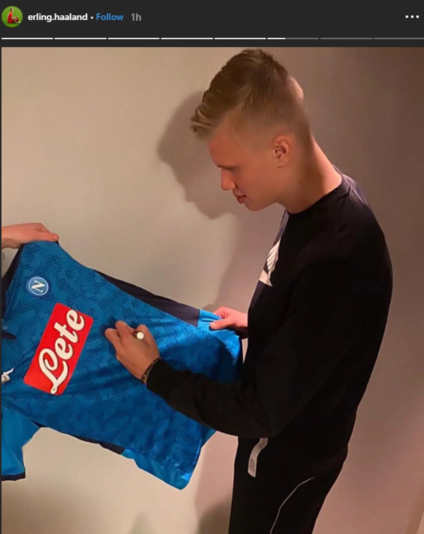 Efterfølgende delte han nemlig et billede af sig selv, der signerer en Red Bull Salzburg-trøje efterfulgt af blandt andet en Leeds-trøje og en Napoli-trøje.