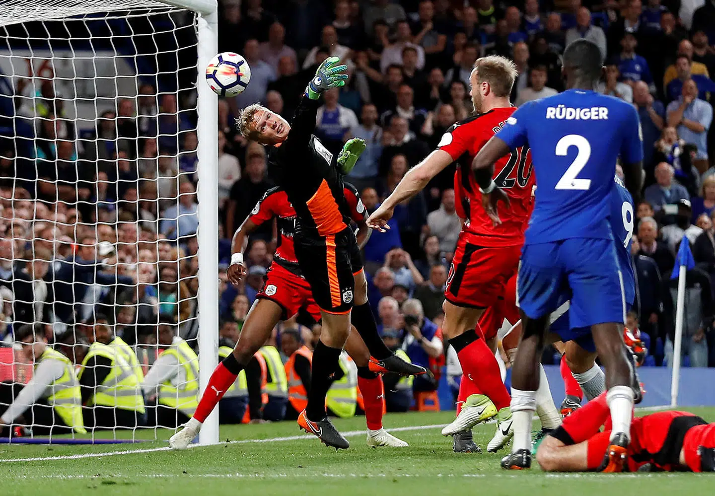 Her sendte Chelsea-danskeren Andreas Christensen et hovedstød mod Huddersfield-målet. Lössl var i fuld fart på vej mod venstre side af målet, men han formåede at skifte retning på et splitsekund og parere Christensens hovedstød på stolpen og væk fra sit mål.
