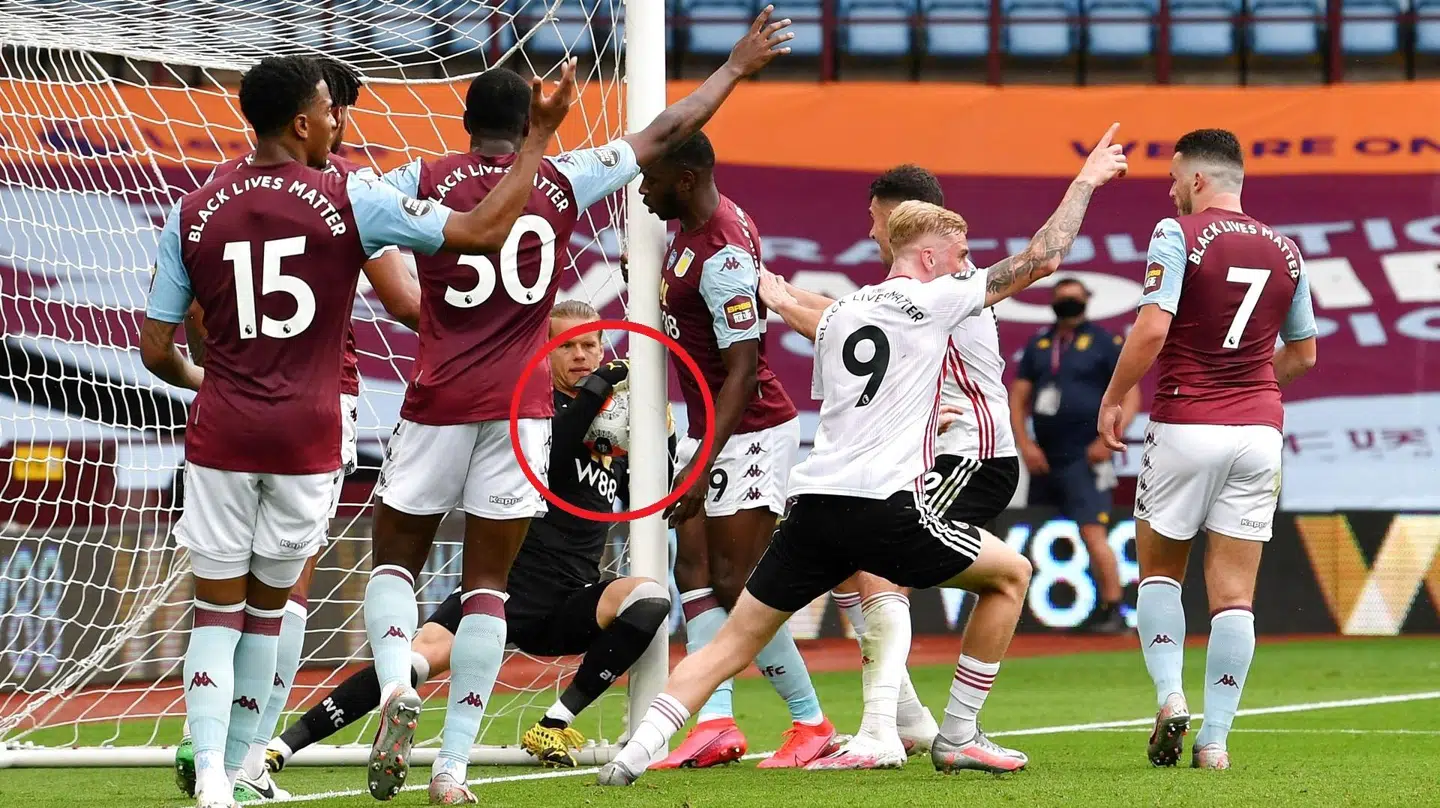 Der hænger Aston Villa-målmand Ørjan Nylan i sidenettet og med bolden i hænderne, og det mere end bare ligner et klart mål. Det var et klart mål med bolden over stregen. Men det blev bare ikke dømt.