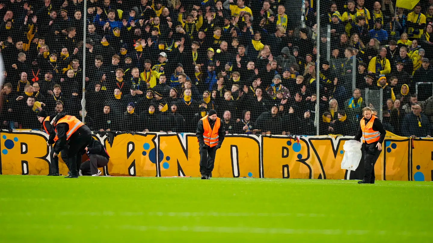 Kampen er afbrudt på grund af kasteskyts fra Brøndbys tilskuerafsnit.