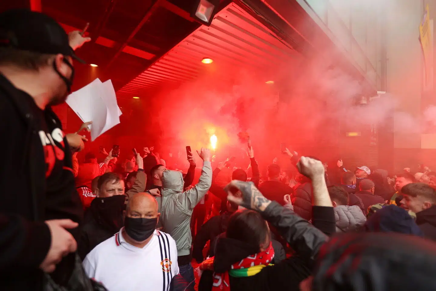 Her var tusindvis af Manchester United fans mødt op for at protestere mod klubbens ejere i et forsøg på at få klubben tilbage til sine gamle værdier og mod beslutningen om at være med i den meget omdiskuteret Super League. Det gjorde de både udenfor det hotel, som United-spillerne boede på, men også ved stadion.