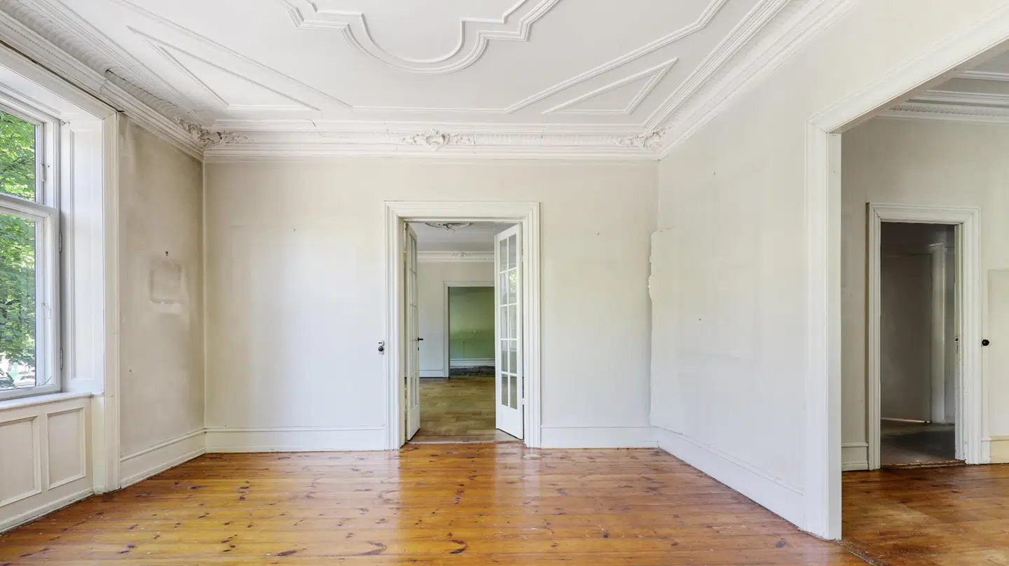 Det syv værelses store hjem ligger i en ejendom fra 1894, hvor ejerlejlighederne er opdelt i ideelle anparter, som derfor ikke kan belånes.