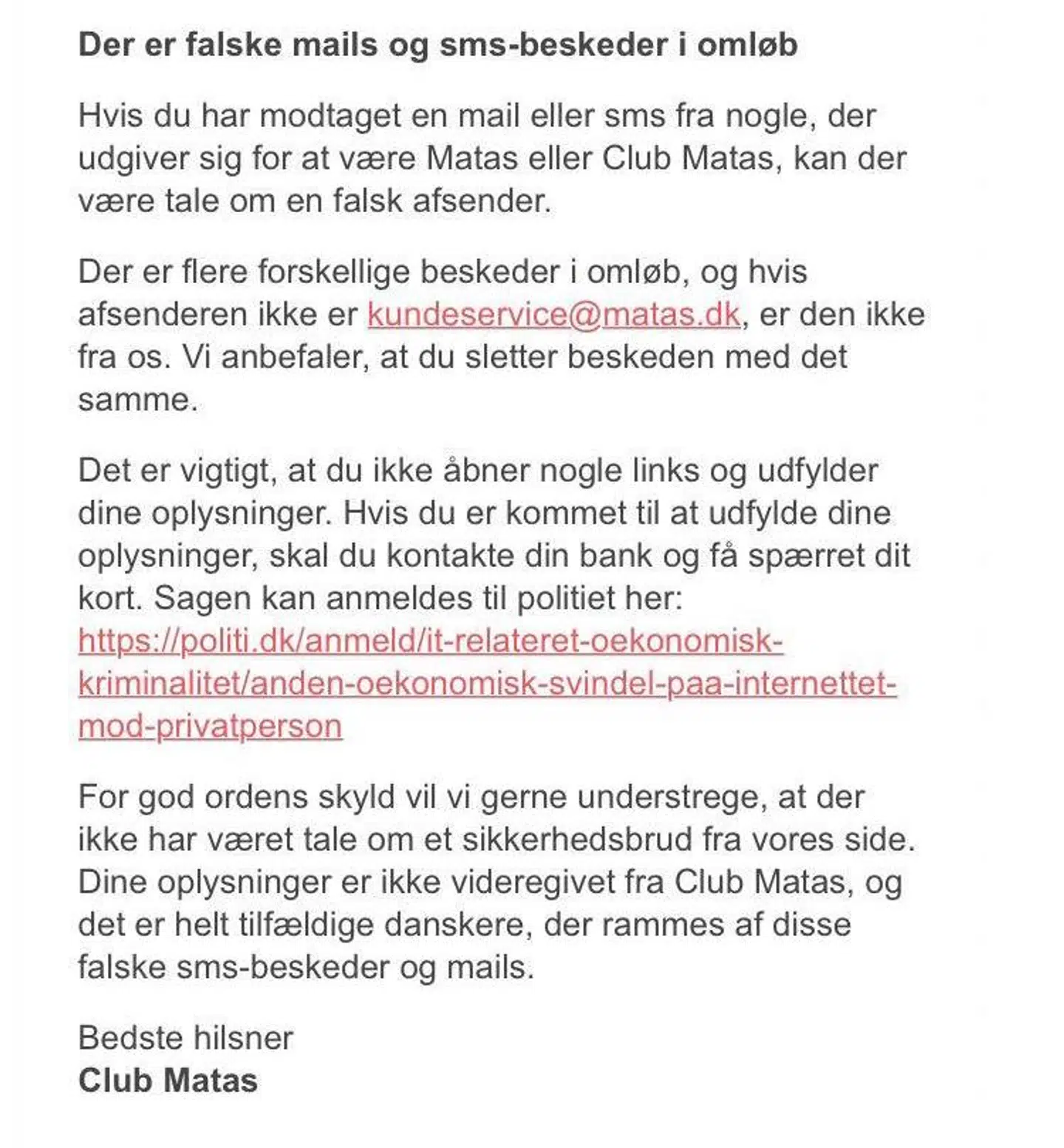 'For god ordens skyld vil vi gerne understrege, at der ikke har været tale om et sikkerhedsbrud fra vores side. Dine oplysninger er ikke videregivet fra Club Matas,' fastslår kæden i e-mailen.