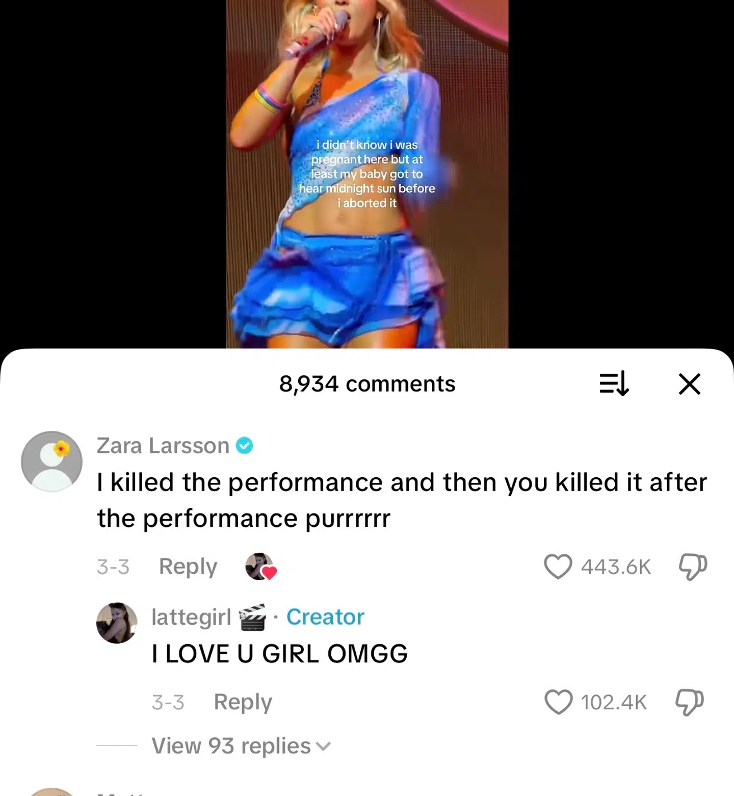 Verdensstjernen Zara Larssons 28-årige joke kom som svar på en fans video fra en af Larssons koncerter, hvor den pågældende fan ikke vidste, at hun var gravid, men at 'babyen' i det mindste fik hørt 'Midnight Sun' inden aborten.