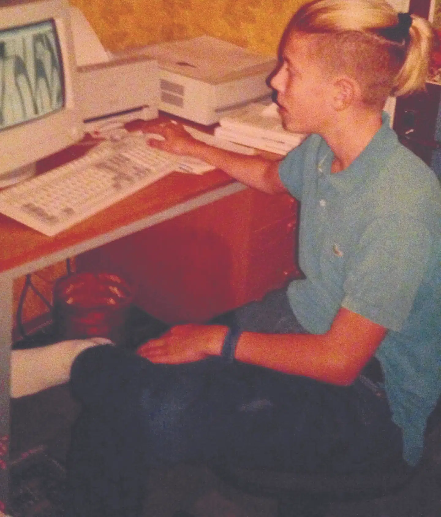 De seneste tretten år har jeg ikke haft hår på hovedet, men her, da jeg var 13 år og lige havde fået en computer, blev jeg klippet som dem fra bandet East17. Min frisør sagde i 2005, at jeg havde en pæn hovedform, så jeg kunne godt tåle at være skaldet, så det fortsætter jeg med, især fordi jeg har fået lidt høje tindinger efterhånden. Jeg blev ikke mobbet i skolen, selvom jeg måske var lidt anderledes. Min bedste ven Stefan var lige omkring to meter høj, og hvis der var nogen, der prøvede at mobbe mig, stod han ved siden af og behøvede bare at kigge på dem. Pigerne var ret vilde med mig i perioder, og jeg var altid meget gode venner med dem også. Der var forresten en 386 processor i computeren, og den var med Windows 3.1, og ved siden af havde jeg en Super Nintendo, jeg kunne spille Super Mario Cart og Wolfenstein 3D på.