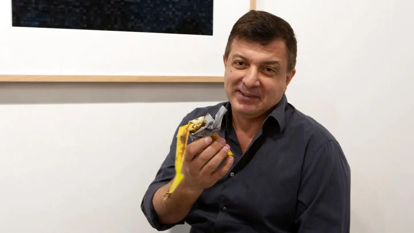 Desværre for Cattelan er toilettet blevet stjålet, så han må nøjes med at sælge bananer.