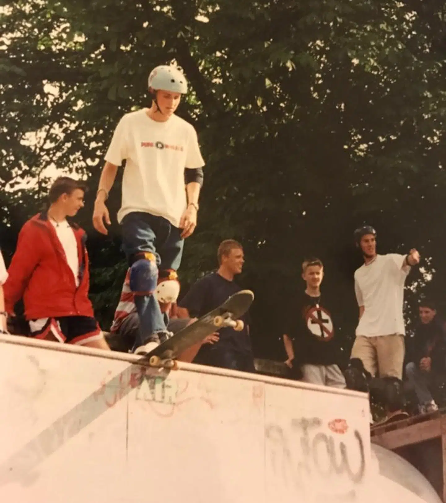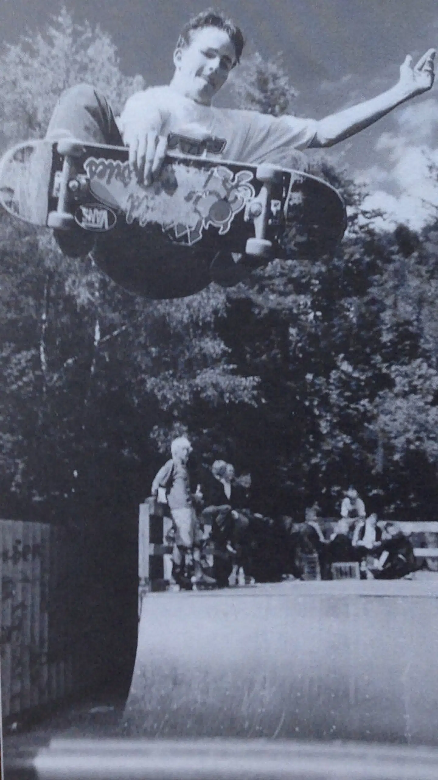 Da jeg var 11 år, skulle jeg første gang droppe ned i rampen, som man ser, jeg er i gang med her på billedet mange år senere. Det gik helt galt. Der er 3- 3½ meter ned, og jeg begyndte med at sætte den forreste fod så langt fremme, at jeg røg direkte ned og flækkede hjelmen. Jeg slog mig så hårdt, at jeg fik en kæmpe Anders Andbule, der bare voksede og voksede. Min søster fik besked på at holde øje med mig derhjemme, men så vidt jeg husker, besvimede hun ved synet af mig. Jeg husker ikke meget fra det øjeblik, jeg lå der i bunden af rampen, til jeg var hjemme i sengen. Efter jeg havde sundet mig, nogen tid, fandt jeg – mens jeg var pissenervøs – ud af at ’droppe’ ind rigtigt. I 1997 vandt jeg skateboardkonkurrencen Prygl i Parken i København.