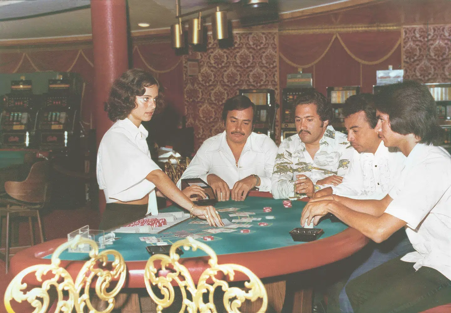 Lige efter jeg blev student, besøgte jeg min mormor, som nu boede i Miami, hun var her blevet gift igen, og jeg fik et job på et flydende kasino på krydstogtskibet TSS Mardi Gras. Efter 14 dages træning og eksamen blev jeg fastansat som croupier, og på billedet her ses de andre croupierer, – mine såkaldte ’casinobrothers’ som alle var fra Puerto Rico. Det var strengt forbudt at fotografere gæsterne, derfor har jeg kun dette opstillede billede. Jeg arbejdede på skibet i et halvt år, 14 timer i døgnet, hvor jeg stort set aldrig så dagslys, og jeg sov i en kahyt langt nede i skibet, lige over maskinen. På et tidspunkt kom der professionelle spillere fra Las Vegas i Casinoet, og min chef sagde til os, at vi skulle sørge for at dele kortene lynhurtigt, så de ikke skulle kunne nå at memorere dem. Jeg husker, de gav mig nogle solide drikkepenge – men det satte jeg nu ikke farten ned af – det lykkedes heldigvis ikke for dem at sprænge banken.