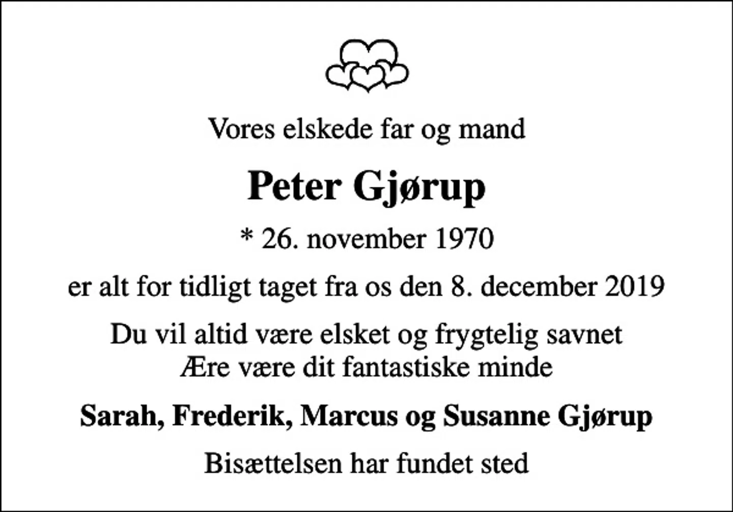 Da døden indtraf, sov han stille ind, omgivet af sin nærmeste familie. Peter Gjørup var bror til Lars Gjørup og fætter til Thomas og Anneli Gjørup. De fire børnebørn af Børge Rasmussen ejede sammen familievirksomheden.