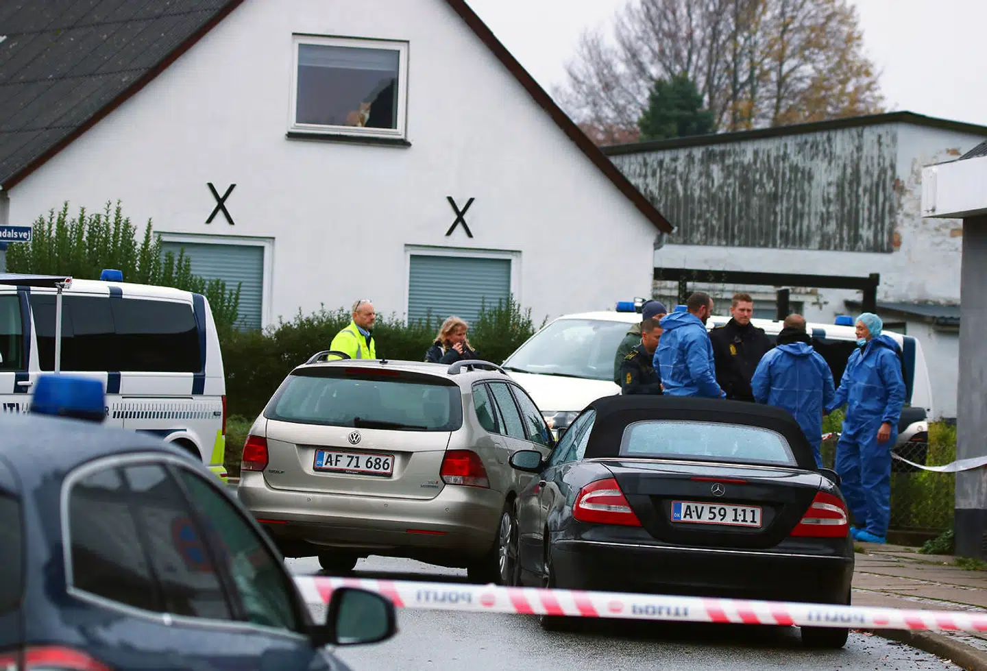 I første omgang holdt der kun en enkelt af politiets biler udenfor i Nørregade. Men det ændrede sig hurtigt. Flere og flere blå blink kom til.