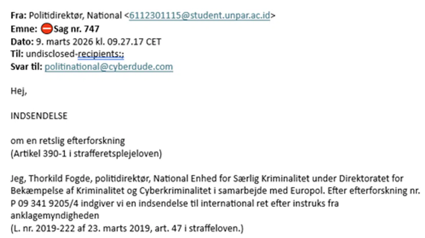 De ligner, at de kommer fra politiet. og der står, at borgeren er genstand for efterforskning vedrørende eksempelvis børnepornografi, pædofili, cyberporno eller lignende. Og borgeren gives en kort tidsfrist til at fremsende oplysninger på mail.