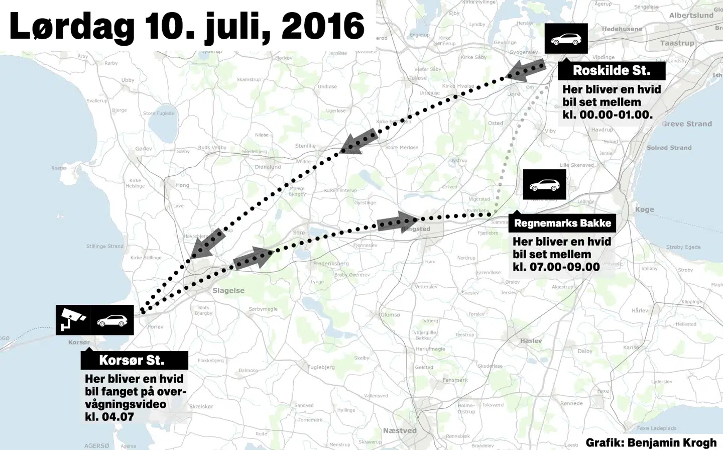 Det vides ikke, om der er en sammenhæng mellem de tre biler, der nu er set i Roskilde, Korsør og Regnemarks Bakke, men signalementet af køretøjerne, føreren samt datoen har flere ligheder.