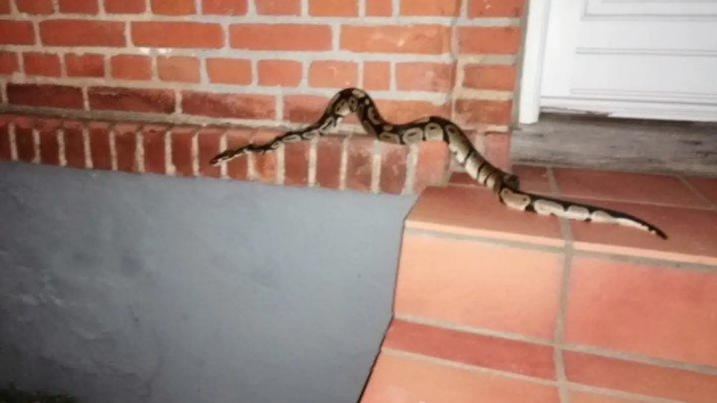 På trappen foran husets hoveddør vred en slange sig nemlig. En slange, der viste sig at være en kongepyton.
