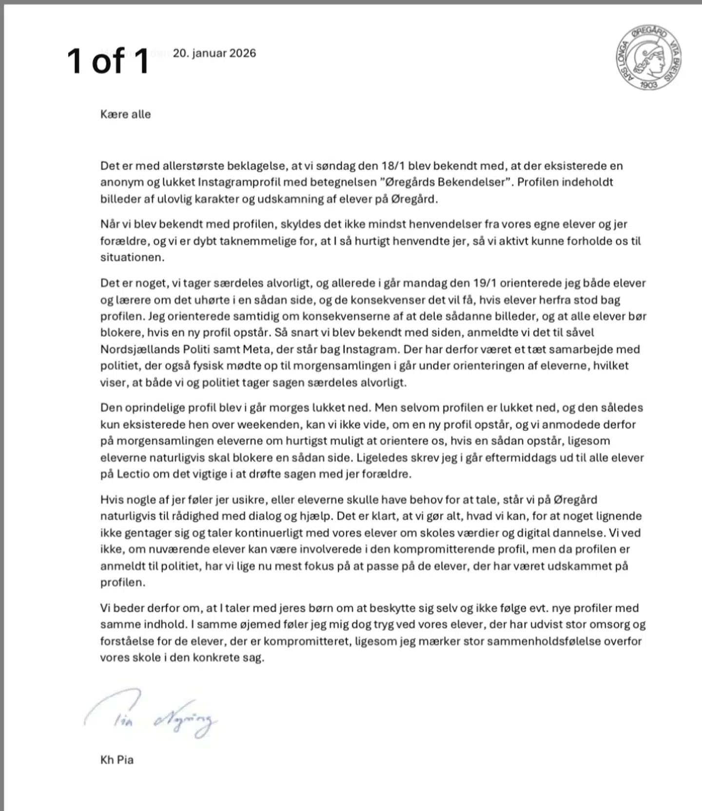 »Det er noget, vi tager særdeles alvorligt, og allerede i går mandag den 19/1 orienterede jeg både elever og lærere om det uhørte i en sådan side, og de konsekvenser det vil få, hvis elever herfra stod bag profilen,« skriver Pia Nyring i brevet.