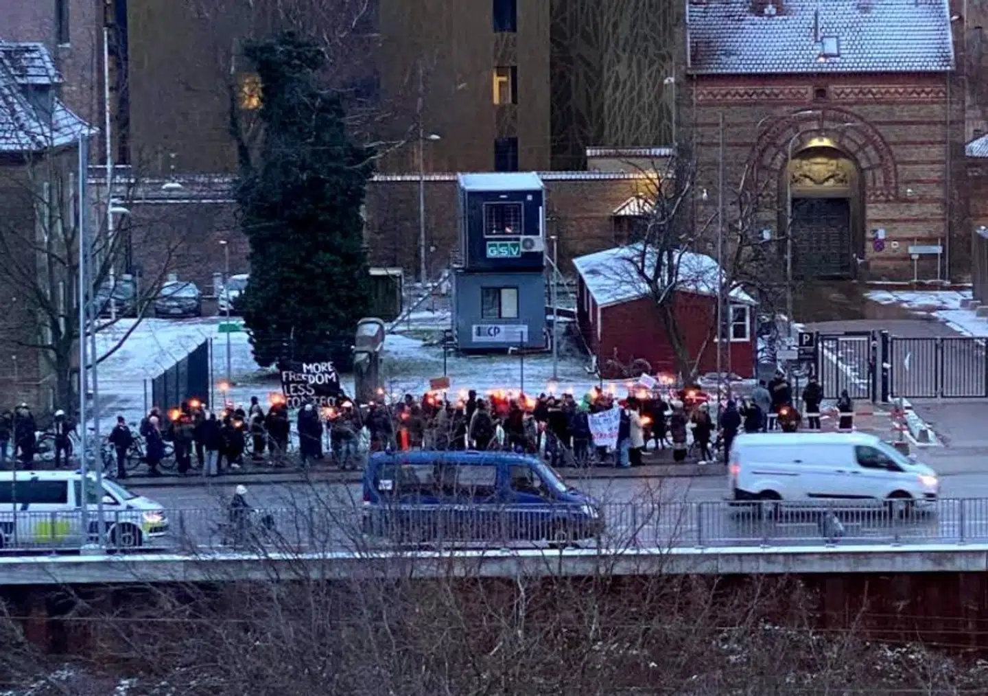 En større gruppe personer er i øjeblikket samlet foran Vestre Fængsel i København til en fakkelprotest for en indsat kvinde.