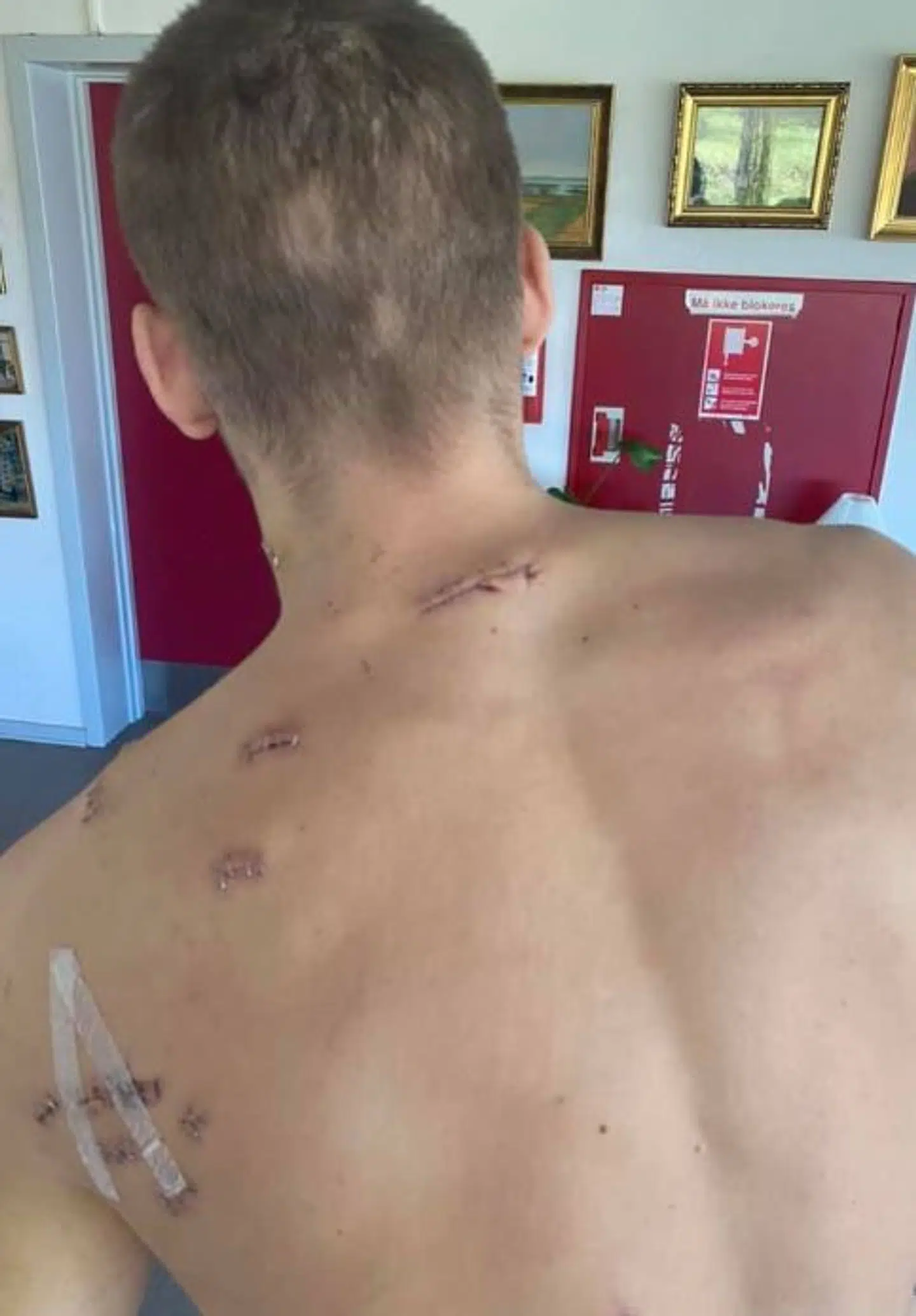 Lægerne har åbnet hele bugen på ham for at kunne tilse hans indre organer, fortæller han. Den ene lunge var punkteret, og det blødte livstruende fra milten.