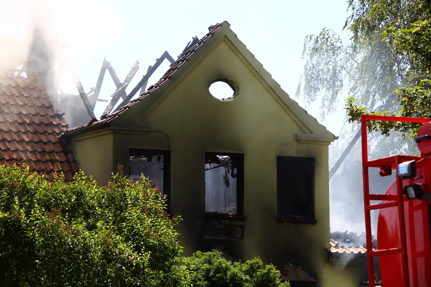 Billeder viser, at huset er blevet massivt skadet af den kraftige brand. Blandt andet er en del af taget væk, mens der også kan ses skader på forsiden af huset.