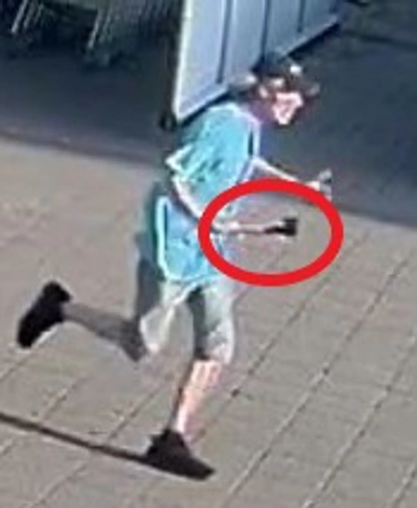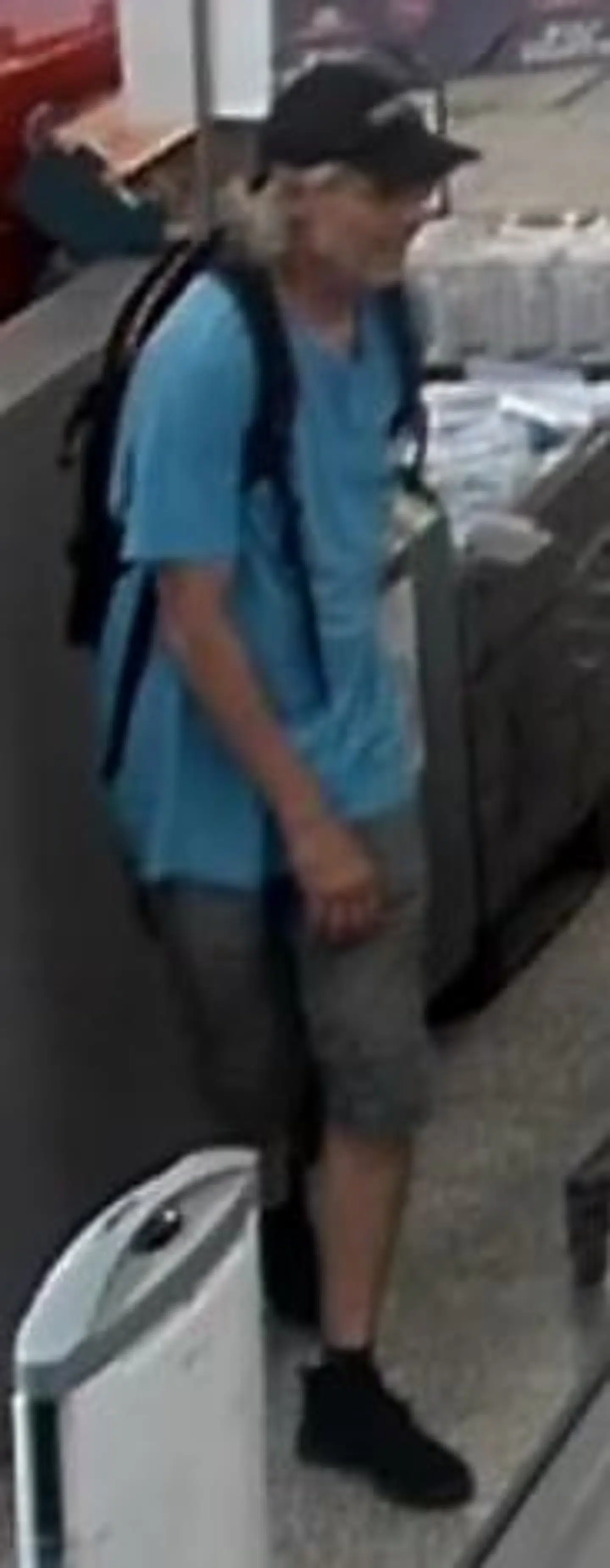 Han har gråt, langt hår og iført en sort kasket, en lyseblå T-shirt og sorte shorts.