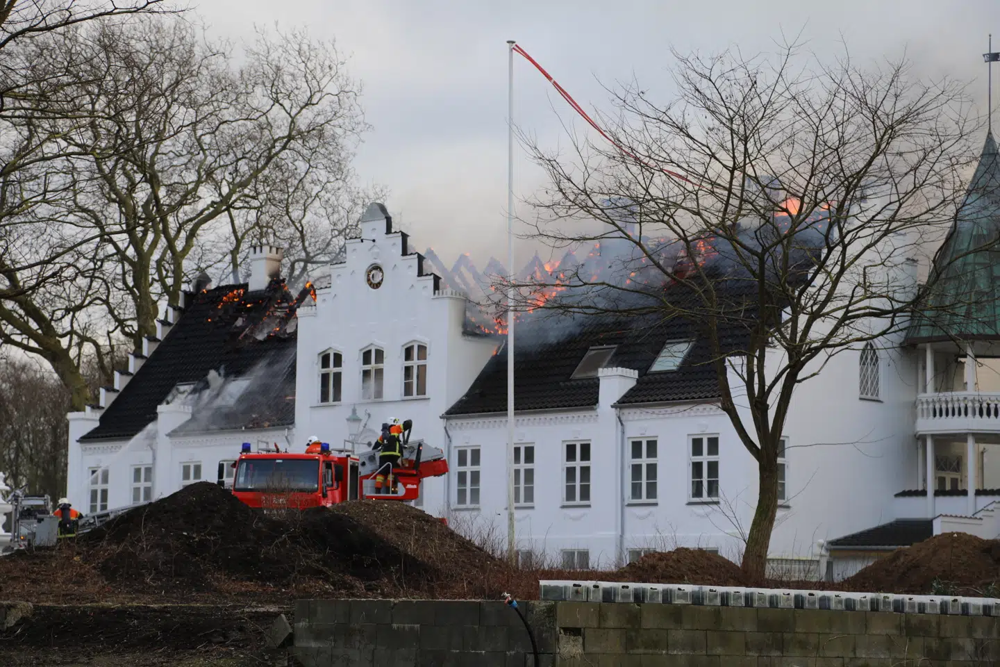 Avisen skriver også, at det meste af taget er væk i flammerne. To af godsets fire skorstene skulle også være væltet som følge af branden. Ingen personer er kommet til skade.