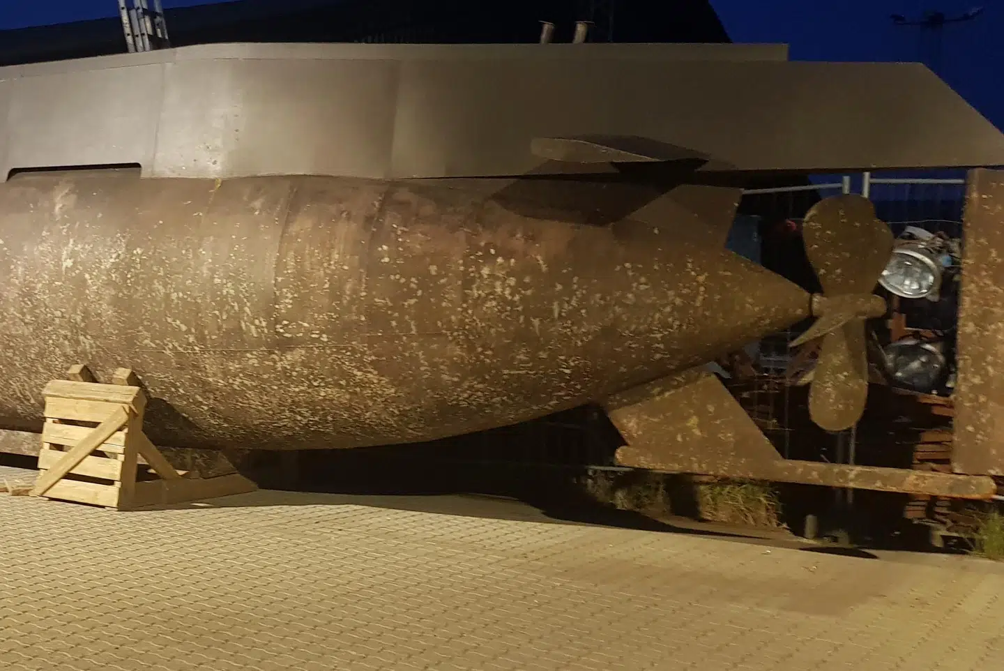 Den enorme ubådsmodel står lige nu opbevaret på en industrigrund ved Avedøre, hvor den er dækket til med en hvid plastikpressening.