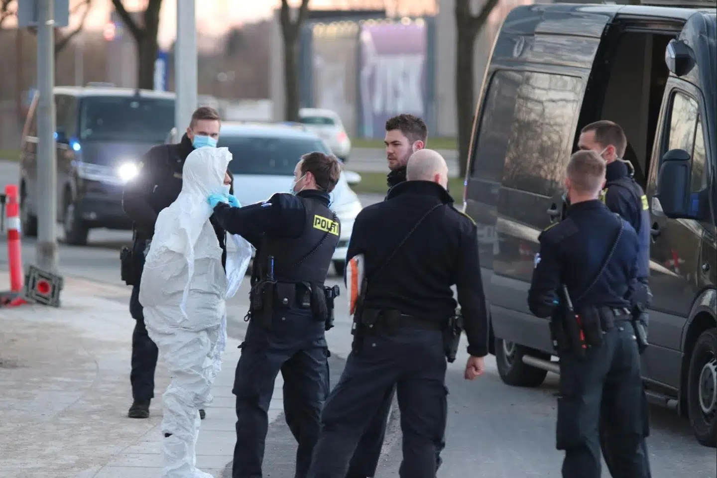 De fire-fem personer er blevet iført hvide dna-dragter, og skal nu afhøres på politigården.