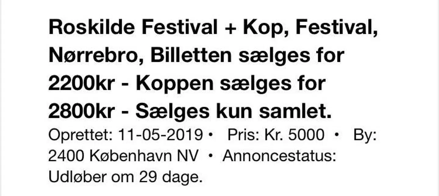 'Billetten sælges for 2.200 kr. – koppen sælges for 2.800 kr. Sælges kun samlet,' står der i en salgsannonce.