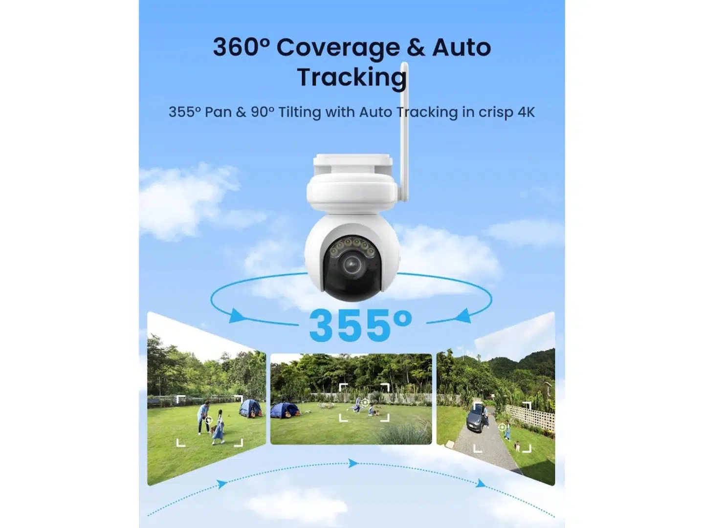Med et kraftigt 20.000 mAh batteri får du op til 96 timers kontinuerlig 4K-optagelse eller op til 500 dages drift i PIR Trigger-tilstand, hvilket giver maksimal fleksibilitet og sikkerhed uden hyppig opladning. Kameraets 355° panorering og 90° tilt sikrer fuld dækning, mens den intelligente autosporing automatisk følger mennesker, køretøjer og dyr i billedet.