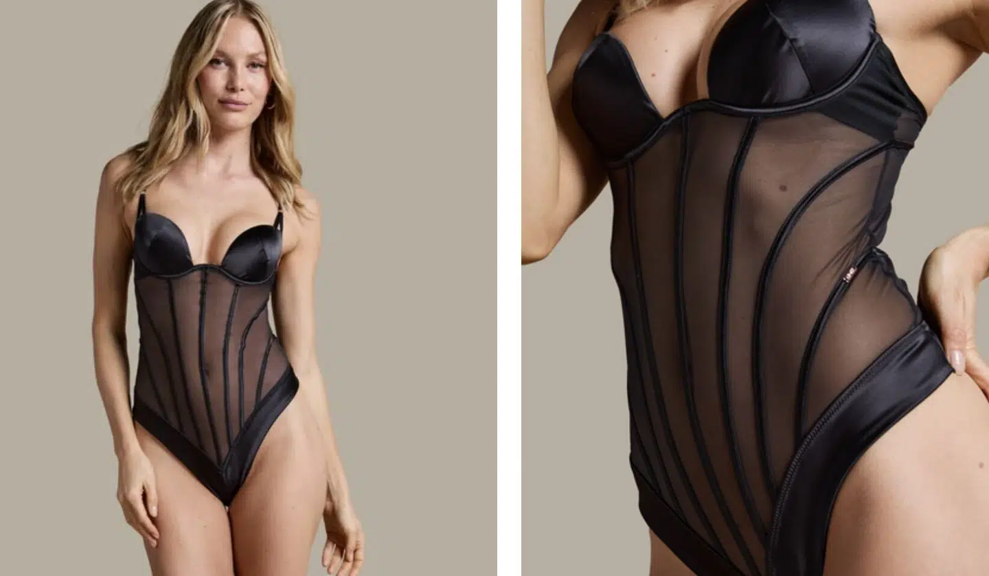 Den vovede stil fuldendes af det elegante satinlook kombineret med gennemsigtige detaljer og et design, hvor balderne er helt synlige. Fremstillet i en blød og strækbar kvalitet af 65% polyester, 30% polyamid og 5% elastan, der føles behagelig mod huden og sikrer en flatterende silhuet.