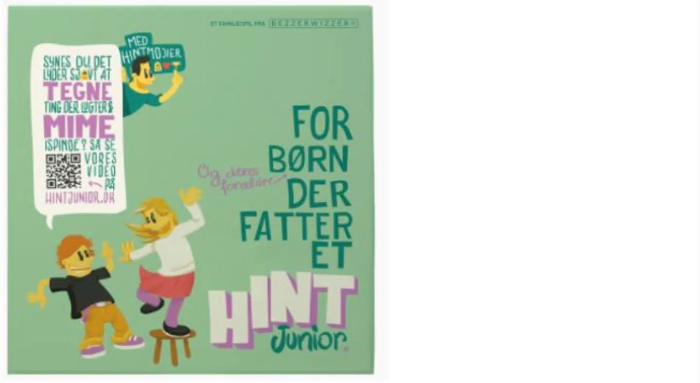 Tegn, mim og hint. Hint junior er et underholdende familiespil, hvor dine holdkammerater skal forsøge at gætte, hvad du prøver at hinte til dem.