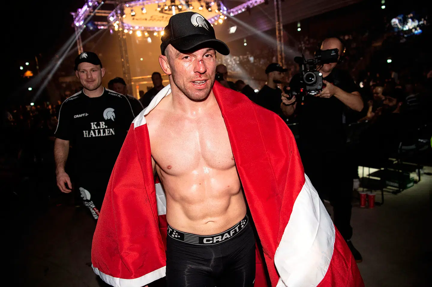 Mark O. Madsen står med sin tandbeskytter i munden, det danske flag om skuldrene og en hårdt forslået næse.